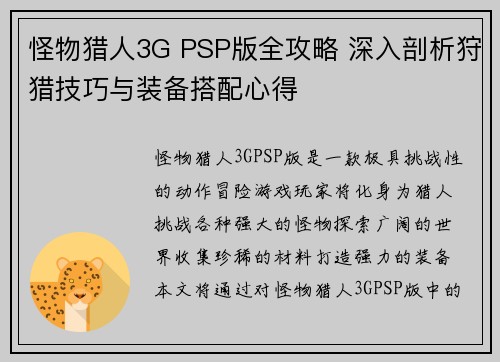怪物猎人3G PSP版全攻略 深入剖析狩猎技巧与装备搭配心得